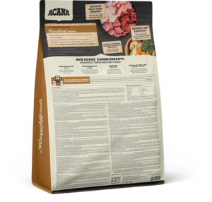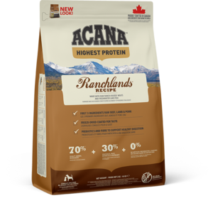 pet foods, our ACANA Highest Protein Ranchlands Recipe is rich with 70% quality animal ingredients like ranch-raised4 beef, pork, lamb, freshwater lake fish and bison, balanced with 30% fruits, vegetables, and botanicals, delivered daily. Artificial colours, flavours or preservatives are never added in our kitchen. Our premium ingredients come from a curated group of farmers, ranchers and fishers we’ve known and trusted for decades, and we approach every batch with an unsurpassed commitment to safety and quality. The result is a protein-rich, nutritious, and delicious dog food to help them live a healthy, happy life.
