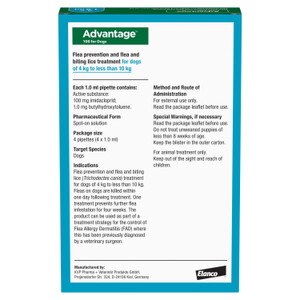 Advantage dog flea droplets are simple to use. There is bit too much liquid so that it makes a mess on the dogs fur and if has a pleasant smell compared to a lot of the other spot on flea treatments. I have had no adverse reaction to using this from any of my animals and it is very effective against fleas