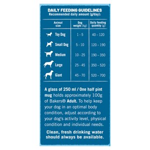 One half pint mug holds approx. 100 g of Bakers® Senior. To help keep your dog in an optimal body condition, adjust according to your dog's activity level, physical condition and individual needs.