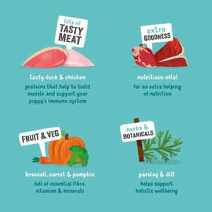 My new puppy is thriving on this duck and chicken recipe. Very easy for him to eat