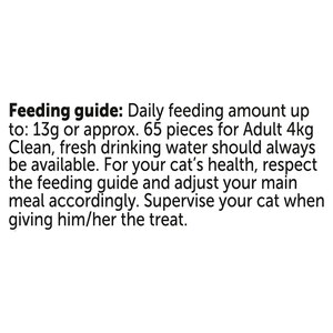 Feeding guide: Daily feeding amount up to: 13g or approx. 65 pieces for Adult 4kg Clean, fresh drinking water should always be available. For your cat's health, respect the feeding guide and adjust your main meal accordingly. Supervise your cat when giving him/her the treat.