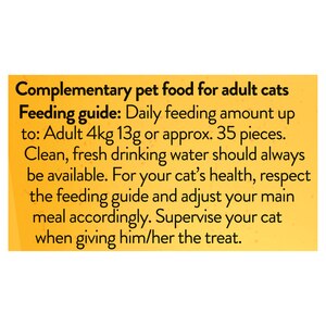 Daily feeding amounts for a 4kg cat is 13g (approx. 35 pieces). Please adjust the main meal accordingly. Fresh drinking water should always be available. Supervise your cat when giving him/her the treat.