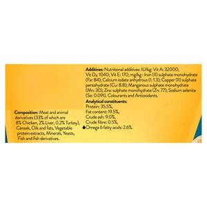 Meat and Animal Derivatives (34%)*, Cereals, Oils and Fats, Vegetable Protein Extracts, Minerals, Various Sugars, Yeast, Fish and Fish Derivatives