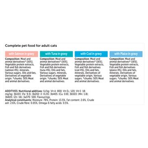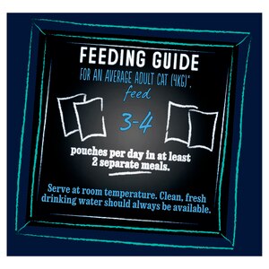 For an average adult cat (4kg), feed 3 to 4 pouches per day in at least 2 separate meals. The adult maintenance averages are based on moderately active cats at normal environmental temperatures. Individual needs vary and feeding should be adjusted as required to maintain your cat at a lean, healthy body weight. Serve at room temperature. Clean, fresh drinking water should always be available.