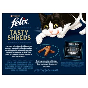 ... are tender and irresistible shredded pieces in a tasty gravy your cat will love! They look, smell and taste delicious, just like food you might have cooked yourself! When feeding your cat Felix Tasty Shreds, you know you're giving him something he really loves the taste of.