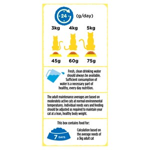 The adult maintenance averages are based on moderately active cats at normal environmental temperatures. Individual needs vary and feeding should be adjusted as required to maintain your cat at a lean, healthy body weight.