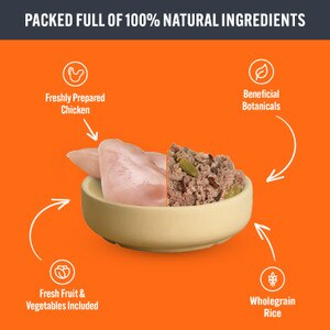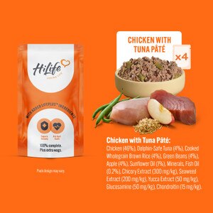 Chicken with tuna, wholegrain rice, green beans and apple: Chicken (46%), dolphin-safe tuna (4%), cooked wholegrain brown rice (4%), green beans (4%), apple (4%), sunflower oil (1%), minerals, fish oil (0.2%), chicory extract (300 mg/kg), seaweed extract (200 mg/kg), yucca extract (50 mg/kg).