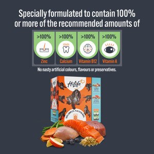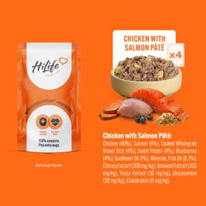 Chicken with salmon, wholegrain rice, sweet potato and blueberries: Chicken (46%), salmon (4%), cooked wholegrain brown rice (4%), sweet potato (4%), blueberries (4%), sunflower oil (1%), minerals, fish oil (0.2%), chicory extract (300 mg/kg), seaweed extract (200 mg/kg), yucca extract (50 mg/kg).