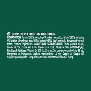 Turkey* (40%: including 4% turkey stomach), chicken* (20%: including 4% chicken trimmings), peas* (4%), carrots* (3%), rice*, minerals, dehydrated vegetal broth.