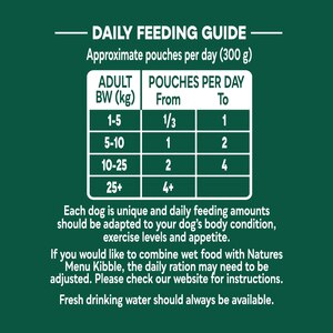 This information is provided as a guide only. Please refer to the product packaging for full details. The feeding quantities are based on the average healthy dog. Individual feeding needs depend on many factors, including weight, age, size, activity level and environment. So, feeding amounts needed may vary and should be adjusted as required to maintain a lean, healthy body and weight.