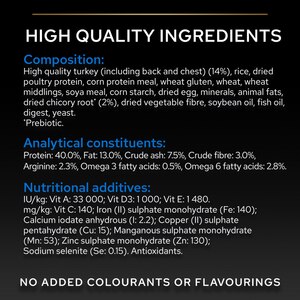 Turkey (14%), Dehydrated Poultry Protein, Rice, Maize Gluten Meal, Wheat Gluten Meal, Wheat, Wheat Fibre, Soya Meal, Corn Starch, Dried Egg, Animal Fat, Dried Chicory Root, Soybean Oil, Cellulose, Minerals, Fish Oil, Digest, Yeasts