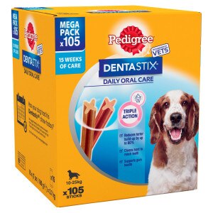 - Pedigree daily dental sticks provide effective oral care for medium-sized dogs; tasty chicken dog chews that are proven to reduce a dog's tartar build up