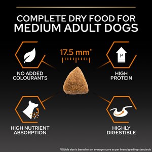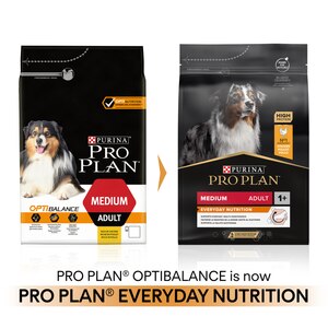 PURINA® PRO PLAN® DOG Medium Adult with OPTIBALANCE™ is a complete dry dog food designed for the needs of medium-sized adult dogs and has been formulated to meet all of his nutritional needs as part of a healthy lifestyle. OPTIBALANCE™ is made with high quality pieces of chicken and enriched with Vit D, Calcium and EPA/DHA from fish origin, to deliver nutritional performance and help promote adult dogs' overall health. This dry adult dog food is formulated for total dental care. It helps support healthy joints for their active lifestyle, and it can help keep their coat shiny from root to tip. PURINA® PRO PLAN® DOG Medium Adult with OPTIBALANCE™ ensures that your dog gets all the nutrition he needs from mealtimes so he can live life to the full.