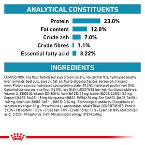 Composition: Rice flour, hydrolysed soya protein isolate, rice, animal fats, hydrolysed poultry liver, minerals, beet pulp, soya oil, fish oil, fructo-oligo-saccharides, borage oil, marigold meal. Protein sources: hydrolysed soya protein isolate (19.3%), hydrolysed poultry liver (5%). Carbohydrate sources: rice flour (45.0%), rice (8.6%).