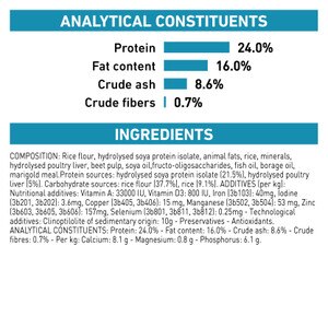 Composition: Rice flour, hydrolysed soya protein isolate, animal fats, rice, minerals, hydrolysed poultry liver, beet pulp, soya oil, fructo-oligosaccharides, fish oil, borage oil, marigold meal. Protein sources: hydrolysed soya protein isolate (21.5%), hydrolysed poultry liver (5%). Carbohydrate sources: rice flour (37.7%), rice (9.1%).