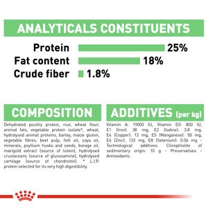 Rice, dehydrated poultry protein, wheat flour, animal fats, wheat, maize gluten, vegetable protein isolate*, barley, hydrolysed animal proteins, beet pulp, soya oil, minerals, fish oil, vegetable fibres, fructo-oligosaccharides, hydrolysed yeast (source of manno-oligo-saccharides), borage oil, marigold extract (source of lutein). *L.I.P.: protein selected for its very high assimilation. Crude ash: 5.9%. Crude fibre: 1.4%. Crude oil fats: 18%. Moisture: %. Protein: 25%.