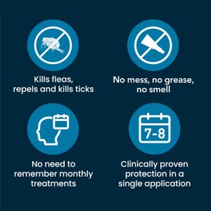 Seresto Flea and Tick Control collar is clinically proven to kill fleas and repel and kill ticks for 7-8 months. It's the longest lasting over-the-counter protection available in a single application, so there's no need to remember monthly treatments.