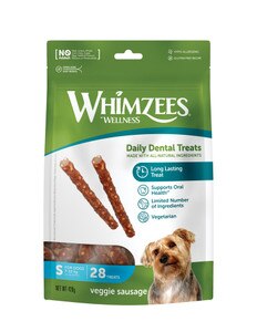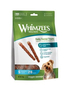 These new Whimzees Veggie Sausages are made using the same vegetable-based ingredients as all Whimzees, but by applying a new technique in combination with the addition of calcium, white spots are created.