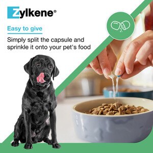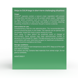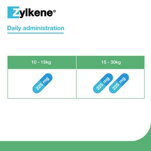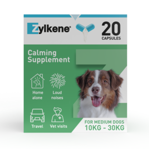 Zylkene 225mg is a calming supplement for medium dogs (10-30kg) to help them cope with separation anxiety and stressful situations inside and outside the home such as fireworks and being home alone.